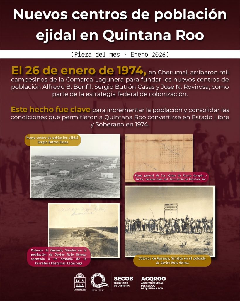 “el 26 de enero de 1974, arribaron a Chetumal mil campesinos de la Comarca Lagunera, quienes formarían los nuevos centros de población Alfredo V. Bonfil, Sergio Butrón Casas y José N. Rovirosa. Los colonos y sus familias llegaron procedentes de Torreón a bordo de 40 autobuses. En Chetumal les dio la bienvenida el Jefe de Departamento de Asuntos Agrarios y Colonización, Licenciado Augusto Gómez Villanueva”.