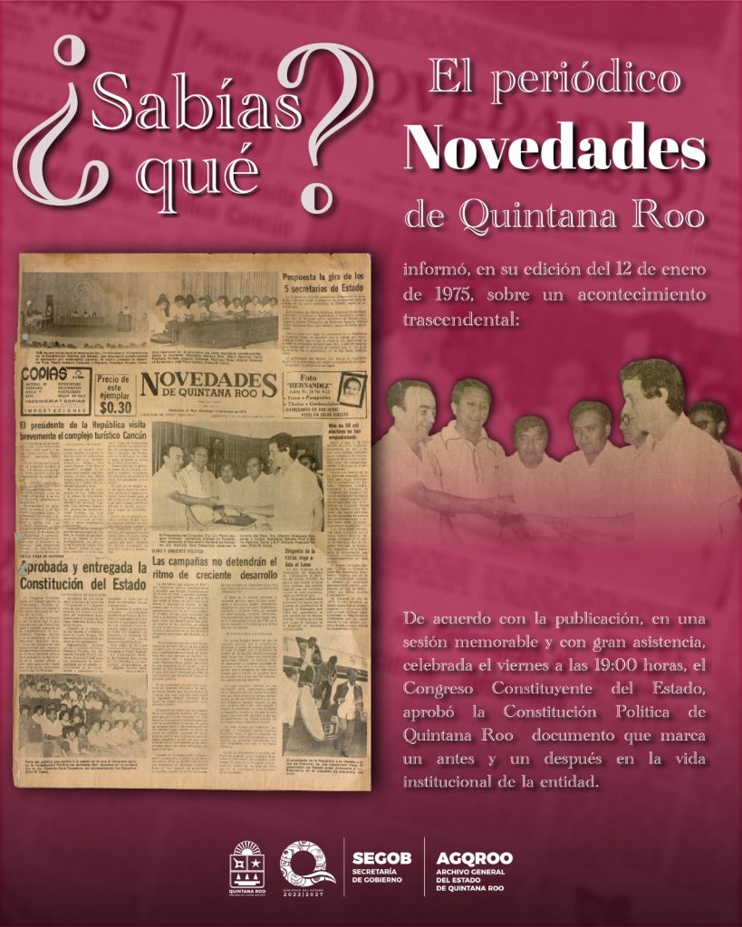 El periódico Novedades de Quintana Roo informó, en su edición del 12 de enero de 1975, sobre un acontecimiento trascendental: la aprobación y entrega de la Constitución Política del Estado.